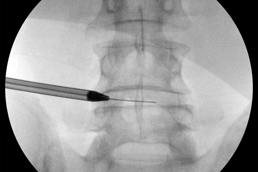 Se opta por el abordaje transforaminal accediendo hasta el canal. En el vídeo se puede apreciar la hernia discal que asoma debido a que no está en su ubicación natural, por lo que no están estructuradas las fibras del disco.